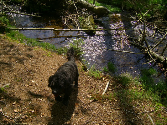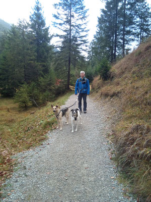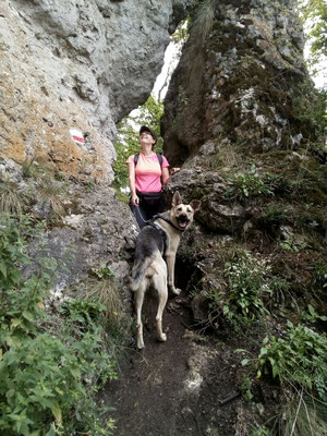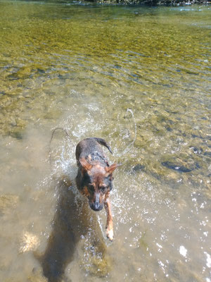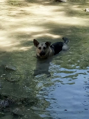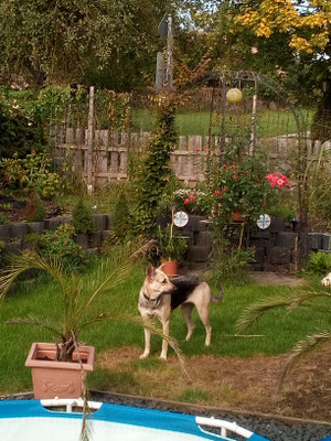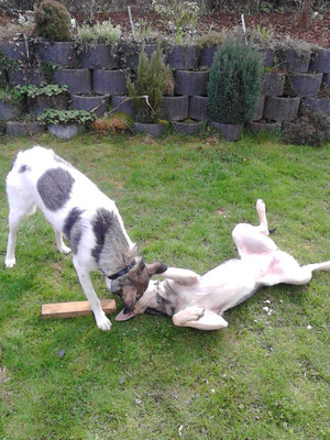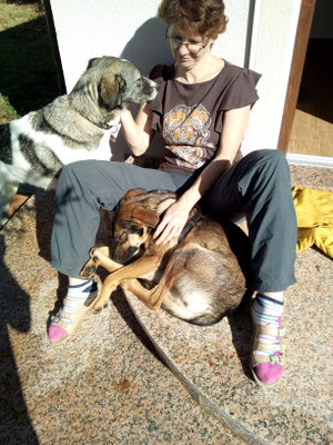 Rhana als Herdenschutzhund-Mix die auf den Strassen von Rumänien gelebt hatte ihren ganz eigenen Kopf, z.B. wenn sie von der Leine gelassen wurde, dauerte es nicht lang und sie war weg. Zwar immer auf Sichtweite aber mit null Interesse zurück zu kommen. Tommy hat mit Rhana Maintrailling angefangen und Rückruftraining gemacht. Dadurch ist die Bindung zwischen den beiden sehr eng geworden und mittlerweile weicht uns Rhana keinen Meter mehr von der Seite wenn wir im Gelände unterwegs sind. Doch da gab es bei Rhana ja noch das Problem mit "Allein bleiben". Solange ein anderer Hund mit ihr alleine zuhause blieb, war alles gut. Doch sobald sie allein war jaulte und bellte sie ohne Unterbrechung. Durch die Niereninsuffizenz von Bella musste ich mind. einmal im Monat zur Blutkontrolle zum Tierarzt. Leider konnte ich, grad im Sommer, Rhana nicht immer mitnehmen. Also was tun? Freunde von uns meinten dazu, wir sollten doch einen dritten Hund dazu holen, bei Ihnen hätte das mit ihrem Hund der auch nicht allein bleiben konnte geholfen. Gesagt, getan und so kam Loona zu uns.