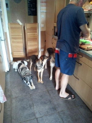Kurz nach dem Tod unserer Volta waren wir auf einen Campingplatz in Kempten. Unsere Jessy war auch schon eine betagte Seniorin die nicht mehr viel laufen wollte. Und so kam der Gedanke "man könnte ja mal im nahegelegenen Tierheim nur mal schauen". Aus dem nur mal schauen, wurde dann die 5 Monate alte Bella und ihre Zwingerkollegin Rhana (1,5 Jahre ). Beide zogen dann nach Silvester bei uns ein. Nachdem wir von Volta verwöhnt waren, denn sie war wirklich ein absoluter einfacher Hund. Und nachdem wir auch mit den Macken von Jessy zwischenzeitlich gut zurecht kamen, waren wir der festen Überzeugung das es überhaupt kein Problem ist, wenn gleichzeitig zwei Hunde einziehen. Und noch dazu waren beim Kennenlernen beide Hunde total lieb zu unserer Jessy.