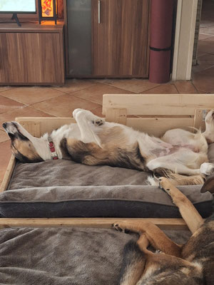 Dezember 2024 haben wir wieder einmal, wie jedes Jahr, Spenden zu Snoopy gebracht. Bei diesem Besuch lernten wir Fenja (zu dem Zeitpunkt grade mal 5 Monate alt) und ihre Schwester kennen und verliebten uns in dieses Fellbündel. Eigentlich war kein dritter Hund geplant. Doch Fenja machte es uns mit ihrem Charme schwer. Und da sie auch schon komplett ausreisefertig war, packten wir sie kurzerhand ein. Fenja ist eine anhängliche Schmusebacke mit Flausen im Kopf. Mit Rhana und unserer Katze tobt sie durchs Haus. Unseren alten Kater (18 Jahre) hingegen putzt sie und ist eher vorsichtig. Anfänglich hatte sie meine Zimmerpflanzen zum fressen gerne aber das haben wir mittlerweile im Griff. Ansonsten ist sie in der Nachbarschaft und in der Hundeschule der absolute Liebling und Herzensbrecher. Ihre Schwester hat kurz darauf übrigens auch ein neues Zuhause gefunden und wir freuen uns mit den neuen Besitzern Kontakt zu haben.